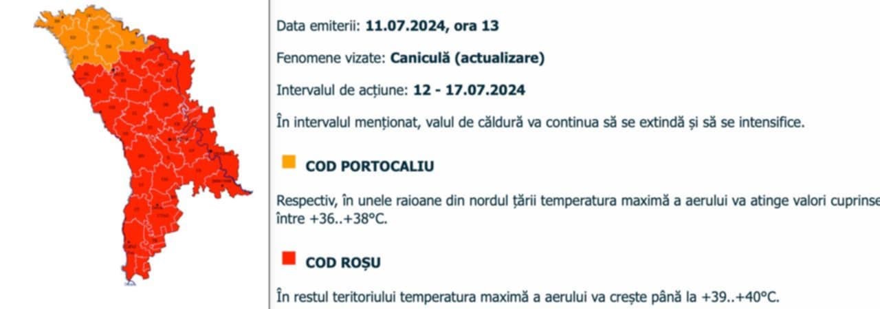 Primăria Chișinău amintește locuitorilor și oaspeților Capitalei că, începând de astăzi a intrat în vigoare avertizarea Serviciului Hidrometeorologic de Stat - Cod ROȘU de caniculă.