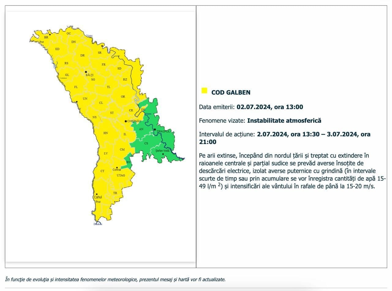 ‼️Primăria Municipiului Chișinău ATENȚIONEAZĂ. Cod Galben de instabilitate atmosferică.
